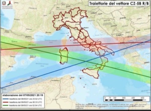 Da stanotte 8 e fino a domani mattina 9 maggio 2021 è possibile che alcuni pezzi del vettore aerospaziale cinese PRC CZ5B possano frammentarsi in atmosfera e cadere in territori del centro sud Italia. L´area interessata della Sicilia è la fascia settentrionale tirrenica, sia pure con basso rischio. Da quanto appreso, nelle riunioni intercorse in queste ore con il Dipartimento Nazionale di Portezione Civile e l´Agenzia Spaziale Italiana, si tratterà della ricaduta di centinaio di frammenti del peso massimo di qualche centinaio di kg che precipitano verso terra ad una velocità di circa 200 km/h.