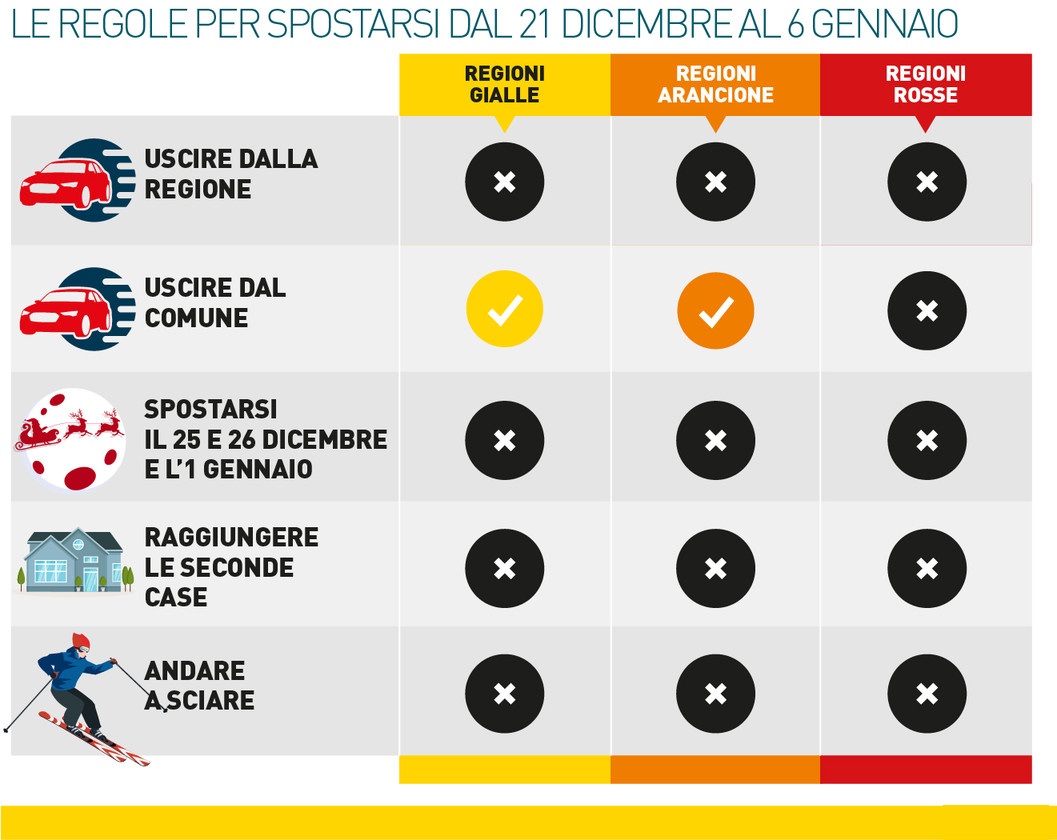 Dal 21 dicembre al 6 gennaio 2021 è vietato uscire dalla propria regione anche se si trova in fascia gialla. Il 25, 26 dicembre e l’1 gennaio è vietato uscire dal proprio comune in tutta Italia. È però consentito muoversi se si deve raggiungere una persona che non è autosufficiente. E dunque nel caso di anziani soli o di parenti malati, sarà consentito andare ad assisterli. Non è invece consentito spostarsi per andare a trascorrere le festività con i parenti che vivono in una regione diversa se non ci sono motivi di necessità. Nel caso di coppie che vivono in due luoghi diversi è consentito spostarsi per il ricongiungimento familiare anche nel periodo di divieto. Nel corso di questo periodo è sempre consentito il ritorno presso la propria residenza, domicilio o abitazione e dunque uno dei due può ritornare in qualsiasi momento dove lavora o studia.