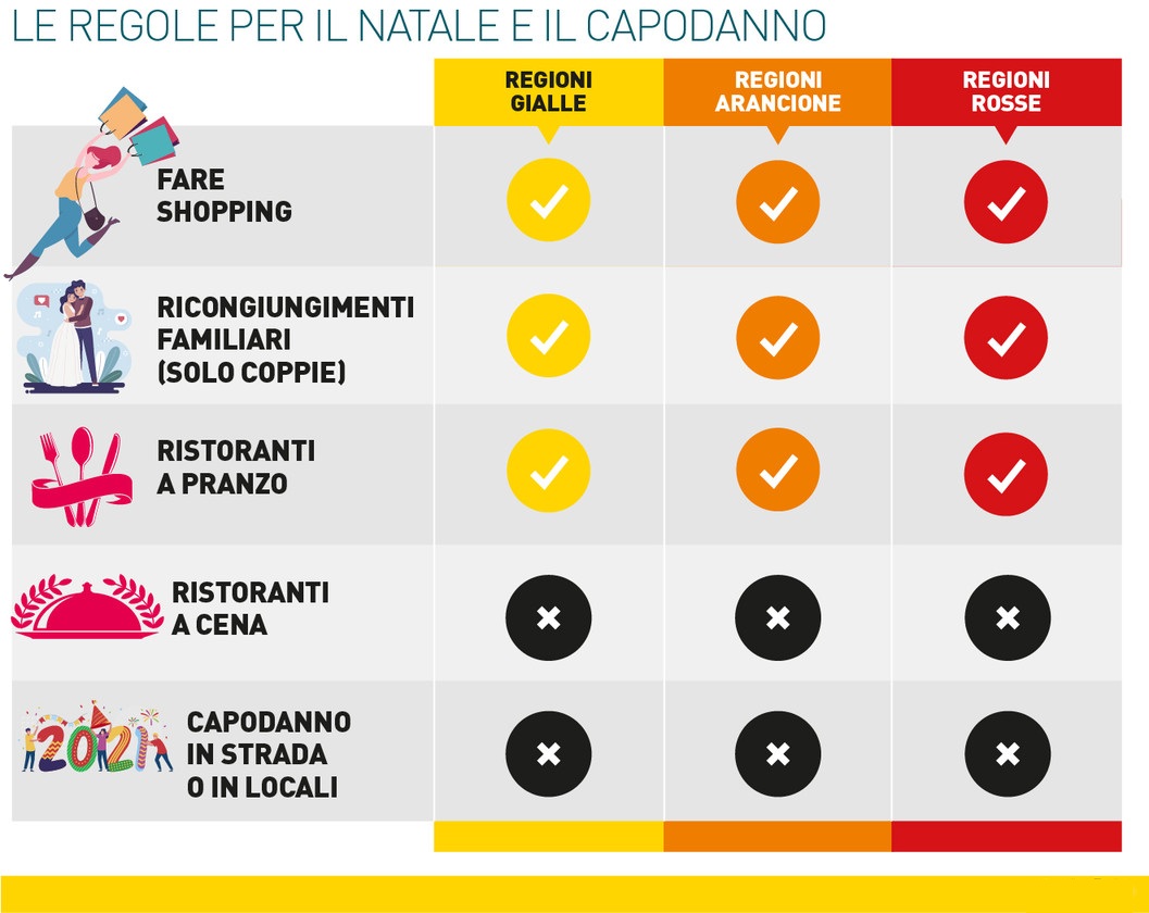Il giorno di Natale è consentito andare a pranzo a ristorante. La raccomandazione per chi invece decide di rimanere a casa è di non invitare persone non conviventi. E comunque di proteggere le persone anziane e con fragilità, anche utilizzando il distanziamento e le mascherine quando non si sta a tavola. È confermato il divieto di organizzare feste nei locali pubblici e nei luoghi privati. Così come non si può uscire dal proprio comune. La sera della vigilia di Natale, il 24 dicembre si deve rientrare nella propria abitazione entro le 22. La messa di Natale sarà celebrata alle 20 e la Conferenza episcopale ha comunque raccomandato alle parrocchie di fissare funzioni religiose nell’arco dell’intera giornata di Natale per evitare gli assembramenti e sempre nel rispetto dei protocolli che prevedono l’uso della mascherina, il distanziamento e le acquasantiere vuote.