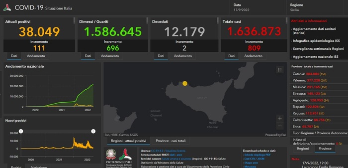 Il tasso di positività è al 9,5%, in aumento rispetto all’8,5% di ieri. La Sicilia è al sesto posto per contagi. Gli attuali positivi sono 38.049 con un aumento di 111 casi. Sono 696 i nuovi guariti mentre sono 2 le vittime. Il totale dei decessi sale a 12.179.