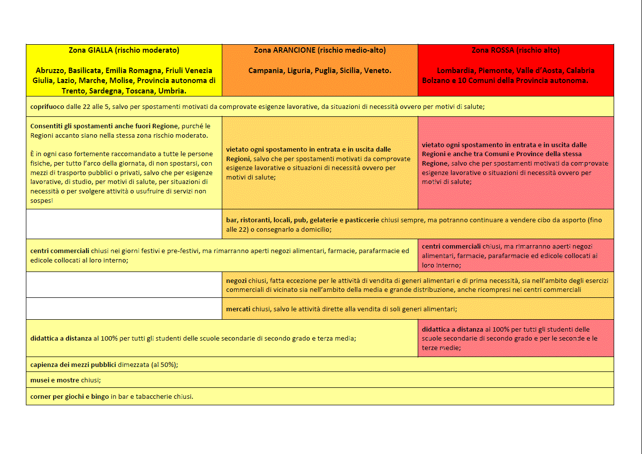 Nelle zone gialle scatta il divieto lasciare la propria abitazione dalle 10 di sera alle 5 del mattino, fatte salve le ragioni di lavoro e di salute. Gli alunni delle superiori seguiranno le lezioni da casa, mentre i mezzi del trasporto pubblico, autobus, metropolitane, treni regionali, non potranno accogliere più del 50% della loro capienza massima. Fino a oggi il limite è dell’80%. Vengono chiusi i teatri, i cinema e i musei, mentre restano accessibili i parchi e anche le aree gioco. Nelle zone all’aperto resta comunque il divieto di assembramento e l’obbligo di rispettare la distanza di almeno un metro.
