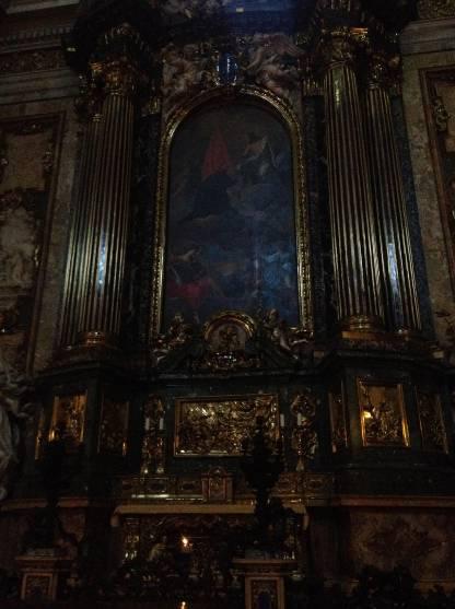 Sono le cinque e mezzo; dal transetto sinistro parte una musica, qualcosa di barocco per coro e orchestra. Il nostro viaggiatore si gira in quella direzione; c’è un altare su cui si intravvede a stento, nella penombra, un quadrone seicentesco con S. Ignazio assunto in cielo. A un certo punto il quadro si illumina e con lui tutta la sontuosa macchina barocca che lo incornicia (alabastro, marmi, onice, ametista, cristallo, bronzo). Entrano trombe e tromboni che annunciano il trionfo, ma ancora non sappiamo cosa succederà.