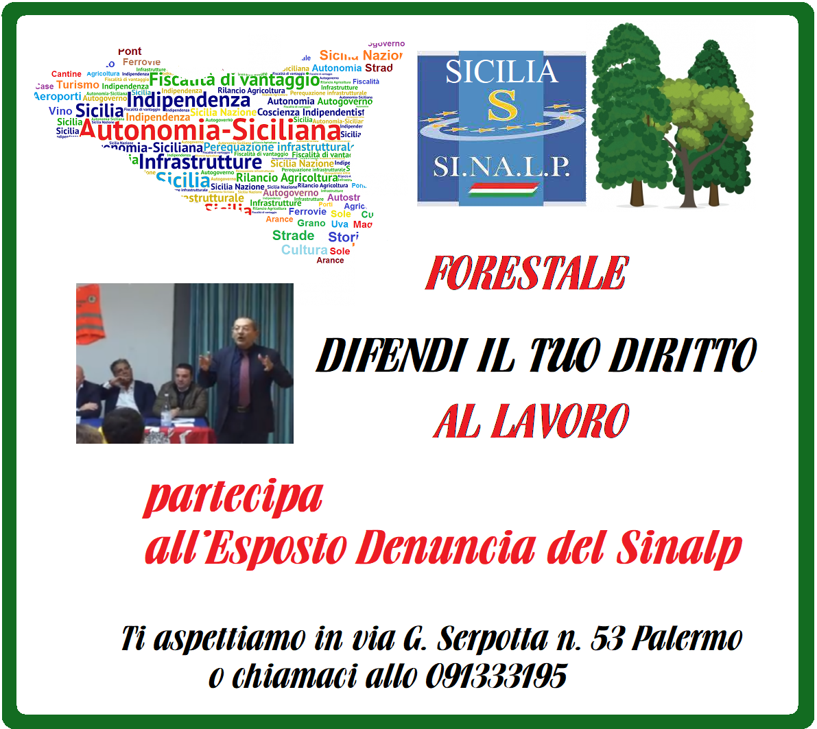 Il Sinalp, non accettando questo ennesimo tentativo truffa che si vorrebbe perpetrare per l’ennesima volta verso il diritto al lavoro dei forestali siciliani, ha deciso di dare il via ad una azione sindacale forte che costringa la Regione Siciliana a dare il via ad un programma di stabilizzazione dei lavoratori assumendoli a tempo pieno ed indeterminato contestualmente ad un sistema di incentivi alla pensione per tutti coloro i quali hanno ormai raggiunto i requisiti per questo importante traguardo della vita.