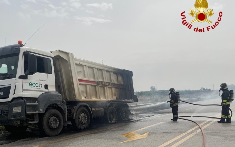 Un incendio ha coinvolto un mezzo pesante adibito al trasporto di terra, poco dopo le 15,00 di oggi sulla SS 192 al Km 172+ 600, sul territorio di Motta Sant’Anastasia (CT).