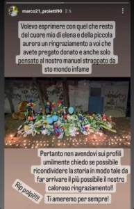 “Volevo esprimere con quel che resta del cuore mio di Elena e della piccola Aurora un ringraziamento a voi che avete pregato donato e anche solo pensato al nostro Manuel strappato da ‘sto mondo infame”, aggiunge.