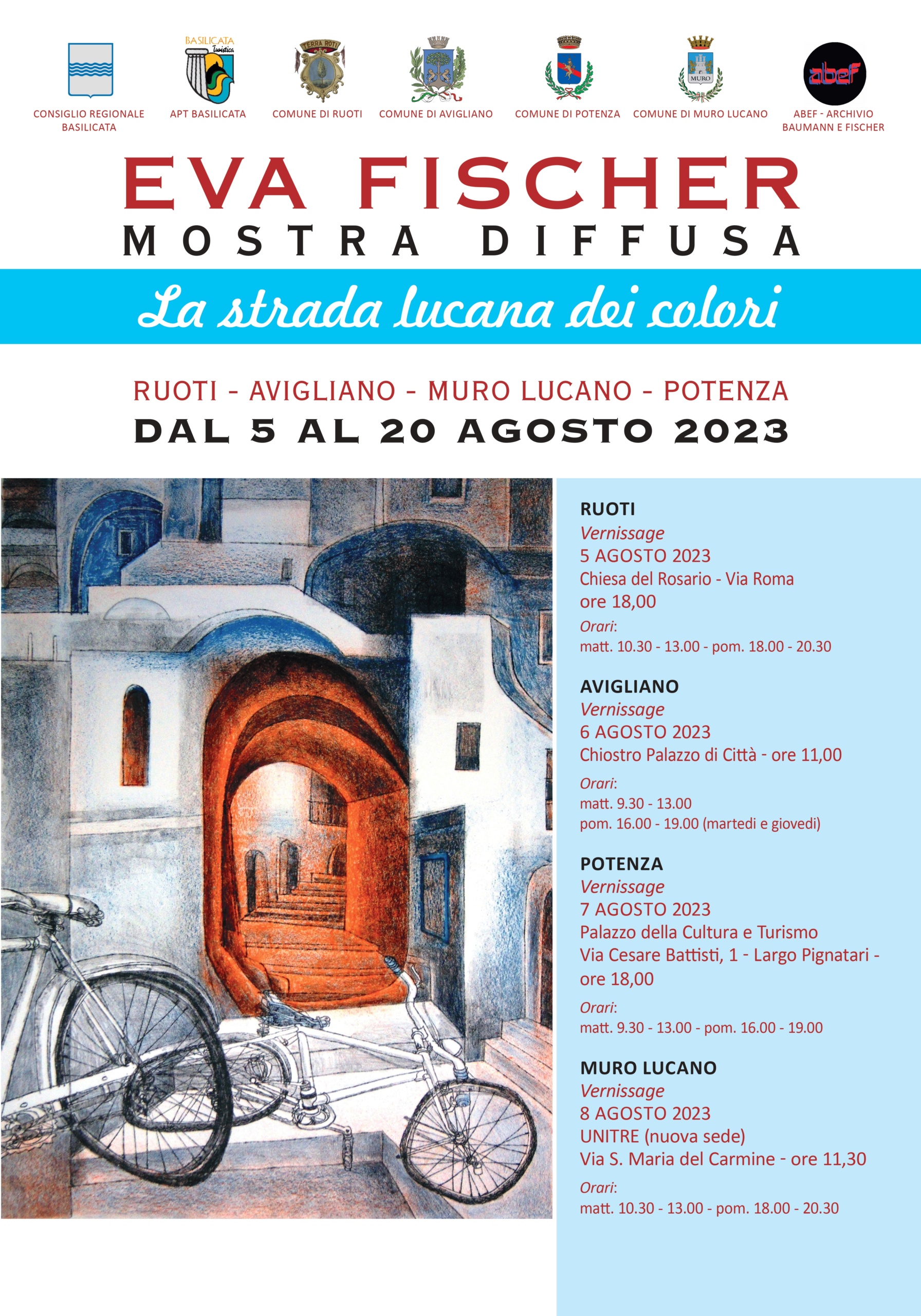 La mostra diffusa di Eva Fischer “La strada lucana dei colori”, si terrà dal 5 al 20 agosto 2023 ed è stata patrocinata dai Comuni di Potenza, Ruoti, Avigliano e Muro Lucano nonché da “ABEF – archivio baumann e fischer”. Hanno inoltre dato il loro patrocinio morale la Regione Basilicata e la APT Basilicata.