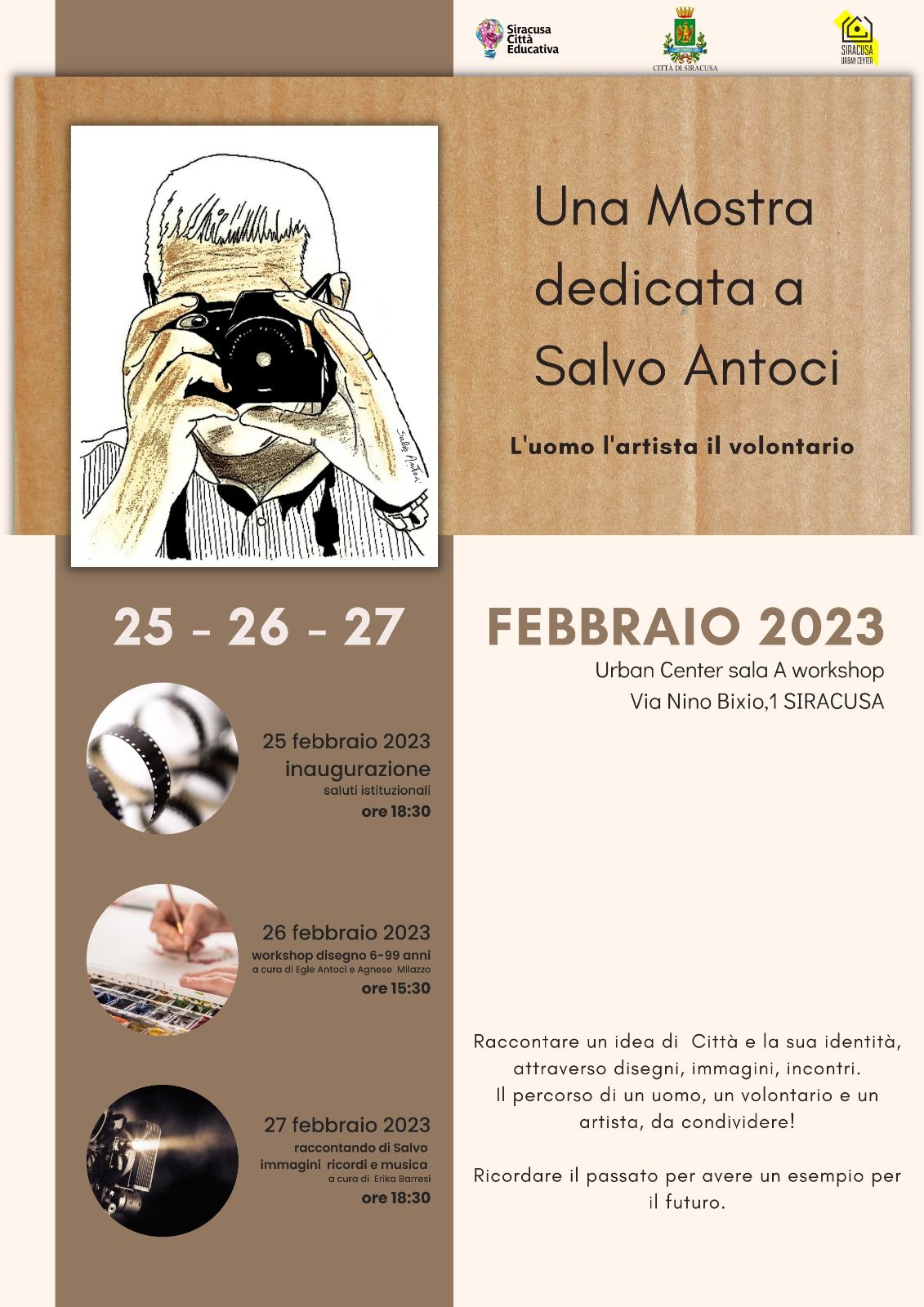Sabato 25 alle 18.30 l’apertura della mostra, alla presenza del sindaco Francesco Italia e delle altre autorità, introdotta dalla giornalista Alessia Zeferino. Domenica 26, dalle 15.30, inizierà un laboratorio creativo di disegno dedicato a grandi e piccini. Lunedì 27, giornata conclusiva, alle 18.30 si terrà una proiezione in ricordo di Salvo Antoci e uno spettacolo teatrale a cura della regista Erika Barresi.