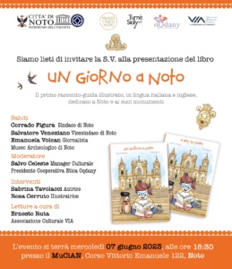 “Un giorno a Noto” è il secondo volume di una collana di libri concepiti dall’illustratrice Rosa Cerruto, di origini modicane, in collaborazione con la guida turistica Sabrina Tavolacci, per raccontare, a grandi e piccini, le città UNESCO della Sicilia sud-orientale. “Il nostro racconto- guida è un vero e proprio omaggio all’incantevole città di Noto- ha dichiarato la Cerruto-. E offre, soprattutto ai più piccoli, l’esperienza di una lettura in cui il sogno e il divertimento si aprono alla conoscenza e alla creatività”. Le fa eco la Tavolacci: “La storia ha per protagonisti il bimbo Nicolò, il fidato cane Giufà e il principe rospo Corradino; che, nel tentativo di strappare un bacio alle turiste per tornare ad esser principe, si imbatte nei due piccoli amici e diventa la loro guida turistica d’eccezione. Attraverso la passeggiata tra i palazzi storici, le chiese e i monasteri della Noto Giardino di pietra, il piccolo lettore comprenderà meglio lo stile Barocco e conoscerà i monumenti più significativi di questa meravigliosa città UNESCO.”