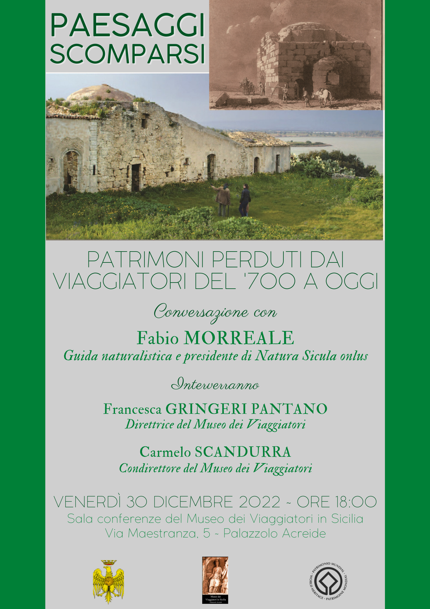 Il Museo dei Viaggiatori in Sicilia di Palazzolo Acreide organizza la conversazione “Paesaggi scomparsi. Patrimoni perduti dai Viaggiatori del ‘700 a oggi”, che si terrà venerdì 30 alle ore 18:00 nella sala conferenze del Museo (ingresso da via Maestranza, 5).