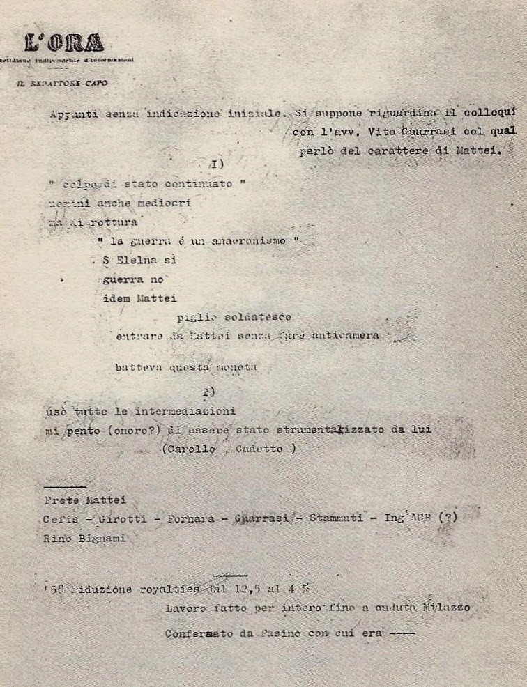 La misteriosa busta gialla e Verzotto. Ma c’è dell’altro e riguarda proprio la sparizione della busta gialla. Secondo i giudici De Mauro l’avrebbe data allo stesso Verzotto. Il 14 settembre 1970, nei locali dell’Ems in via del Fante, De Mauro e l’ex senatore avrebbero proprio concordato la consegna del “copione”, ormai concluso, perché proprio Verzotto si sarebbe offerto di dare una mano per la sistemazione finale, prestandosi a fare da “corriere” portandolo a Roma a Rosi. De Mauro e Verzotto erano in buoni rapporti parlarono di certo anche del Golpe Borghese, che era il fatto più pericoloso tra i due e la dimostrazione è nell’appunto che De Mauro scrive: “Colpo di Stato”. Il Caso Mattei era un fatto già chiuso con il racconto di De Mauro, in base alle ricerche che aveva fatto già nel 1962, e in parte ricercate, oltre a quelle dettate nel mese di settembre del 1970 dallo stesso Verzotto. Quest’ultimo conosceva bene momenti salienti di Mattei in Sicilia che aveva raccontato a De Mauro, quindi sapeva bene cosa conteneva la lettera indirizzata a Rosi nella busta gialla che doveva essere portata a Roma proprio da Verzotto, che avrebbe potuto aprirla benissimo durante il viaggio, richiuderla o farla sparire se qualcosa non gli garbava. L’altro aspetto, sposa la tesi del doppio coinvolgimento della mafia: sia nel Golpe Borghese, sia nel Caso Mattei e trova la logica nella paura che entrambi i fatti possano, o solo quello del Golpe in programma a dicembre, alla fine, essere svelato.