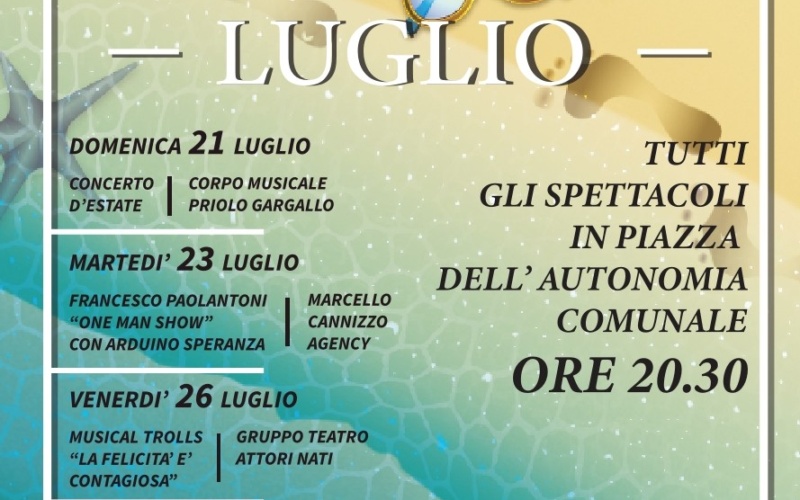Ecco gli eventi del mese di luglio inseriti nel cartellone della manifestazione PRIOLO ESTATE 2024, organizzata dal Comune di Priolo Gargallo: