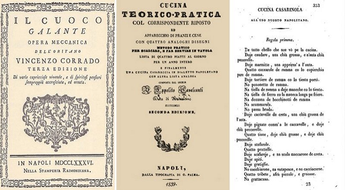 Due i trattati di cucina del periodo: “Il Cuoco Galante” di Vincenzo Corrado, compilato a cavallo tra il XVIII e il XIX secolo, e “Cucina Teorica e Pratica” di Ippolito Cavalcanti della prima metà del XIX.