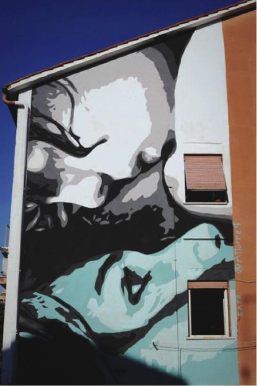 Attorep, con i suoi ritratti romantici che conducono alla riflessione alle relazioni umane sempre più fragili, ha interpretato il Global Goal numero 10, ovvero Ridurre le diseguaglianze. L’opera muraria rappresenta due volti, posti uno di fronte all’altro, non identificabili per razza, etnia e sesso grazie all’astrazione del colore. Le due figure si guardano negli occhi, con uno sguardo di affetto, di amore e di inclusione.