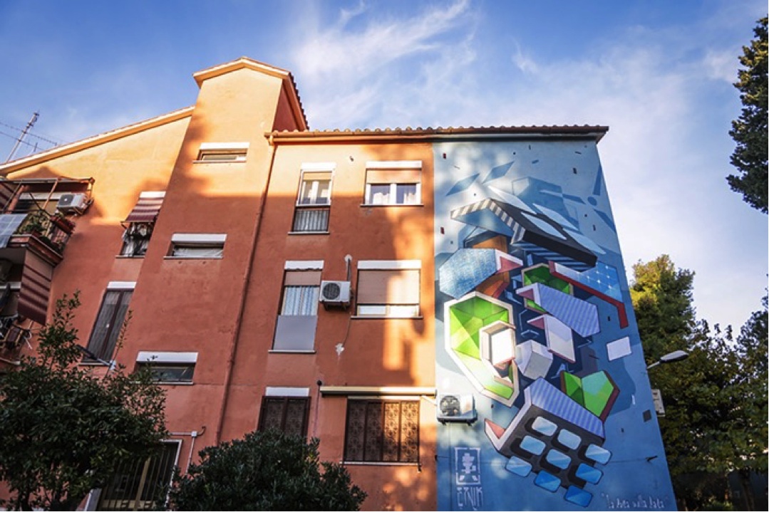 L’urban artist di fama internazionale Etnik, attivo da oltre 30 anni nella scena dell’arte urbana, per il suo murales si è ispirato al goal numero 12 con ‘’La Casa nella Casa’’, il titolo del suo lavoro che oltre ad essere una visione sulla vera e propria architettura abitativa dedicata ai temi ecologici e di riciclo è allo stesso tempo uno spunto a lavorare su sé stessi, sulle nostre abitudini quotidiane. Con le sue illustrazioni geometriche fatto di forme, volumi e cromatiche che talvolta portano a figure astratte, Etnik vuole rappresentare l’equilibrio precario dell’essere umano e l’incessante velocità del mondo contemporaneo. Etnik anche con questo muro porta avanti una personale ricerca artistica capace di veicolare un forte messaggio, il punto di vista dell’artista sulla città e le parti di cui si compone, e con esso sviluppare la sua peculiare poetica.