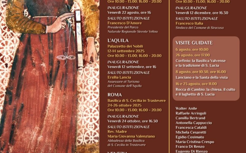 Partirà dell’Abruzzo, nel mese di agosto, una mostra itinerante dedicata a Santa Lucia che, dopo avere toccato una serie di tappe, tra cui Roma e Venezia, si concluderà a Siracusa in occasione dei festeggiamenti per la Patrona del 13 dicembre. Si tratta di un’esposizione collettiva che l’Associazione Culturale Abruzzo in Itinere ha voluto organizzare in occasione dell’anno giubilare. Si intitola “Sul mare luccica…” e l’idea è di celebrare la santa siracusana utilizzando l’estro di venti artisti affermati, ciascuno dei quali utilizza tecniche e materiali diversi: pittura, scultura, vetrata, mosaico, affresco, encausto, fotografia, merletto, arazzo, oreficeria, ferro battuto, opere polimateriche e fiber art. L’esposizione collettiva è curata dall’archeologa Lucia Tognocchi in collaborazione con la storica e critica d’arte Stefania Severi. «Abbiamo aderito a questa operazione culturale – dice il sindaco Francesco Italia – per la sua originalità e perché abbiamo ritenuto giusto, in chiusura dell’anno giubilare, arricchire la festa dedicata alla nostra Patrona con un’iniziativa che certamente richiamerà l’attenzione di siracusani e viaggiatori. La mostra si terrà nell’Ipogeo di piazza Duomo, quindi nel luogo simbolo in occasione delle celebrazione per santa Lucia e conferma quanto sia estesa e sinceramente sentita la devozione verso di lei». Lucia – dicono gli organizzatori – martirizzata il 13 dicembre dell’anno 304 sotto l’imperatore Diocleziano, è diventata simbolo di luce spirituale e materiale, concetto racchiuso nel suo stesso nome. Il patronato della vista è confermato dall’iconografia che, a partire dal 1300, vede la Vergine siracusana solitamente raffigurata con gli occhi contenuti nella coppa o poggiati sul piattino. In Abruzzo Lucia è una delle sante più diffuse insieme all’arcangelo Gabriele, invocata dai pastori i quali ne hanno irradiato il culto lungo percorsi tratturali che per secoli hanno unito il Sannio alla Puglia. Il percorso espositivo comprenderà anche Venezia, dove le opere saranno esposte a novembre nella sede della Scuola internazionale di grafica, per terminare a Siracusa dal 12 al 14 dicembre. Due città che non potevano mancare: l’una per aver ospitato, secondo tradizione, il corpo di Santa Lucia e l’altra per averle dato i natali.