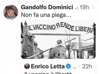 Al post di Letta, che definiva il vaccino una scelta di libertà, il docente – che ha pubblicato diversi commenti critici contro i vaccini e la gestione della pandemia da parte del governo – ha risposto con la foto dell’ingresso del campo di Auschwitz , sostituendo la scritta “Arbeit Macht Frei” (il lavoro rende liberi) con la frase “il Vaccino rende liberi”. Nel suo profilo twitter il professore rimanda ad un canale Telegram con 210 iscritti dove si rilanciano le tesi contro i vaccini e il green pass.