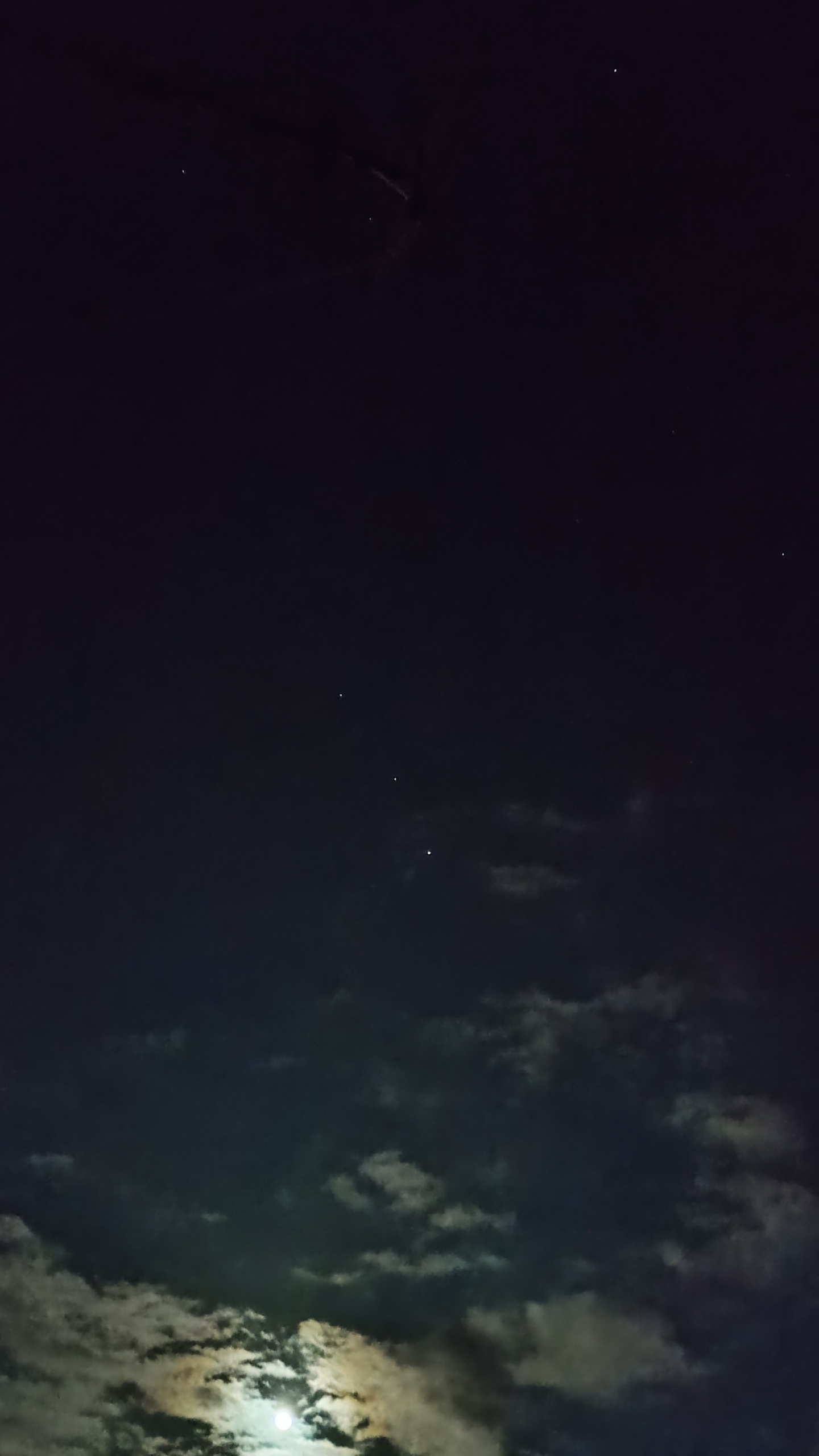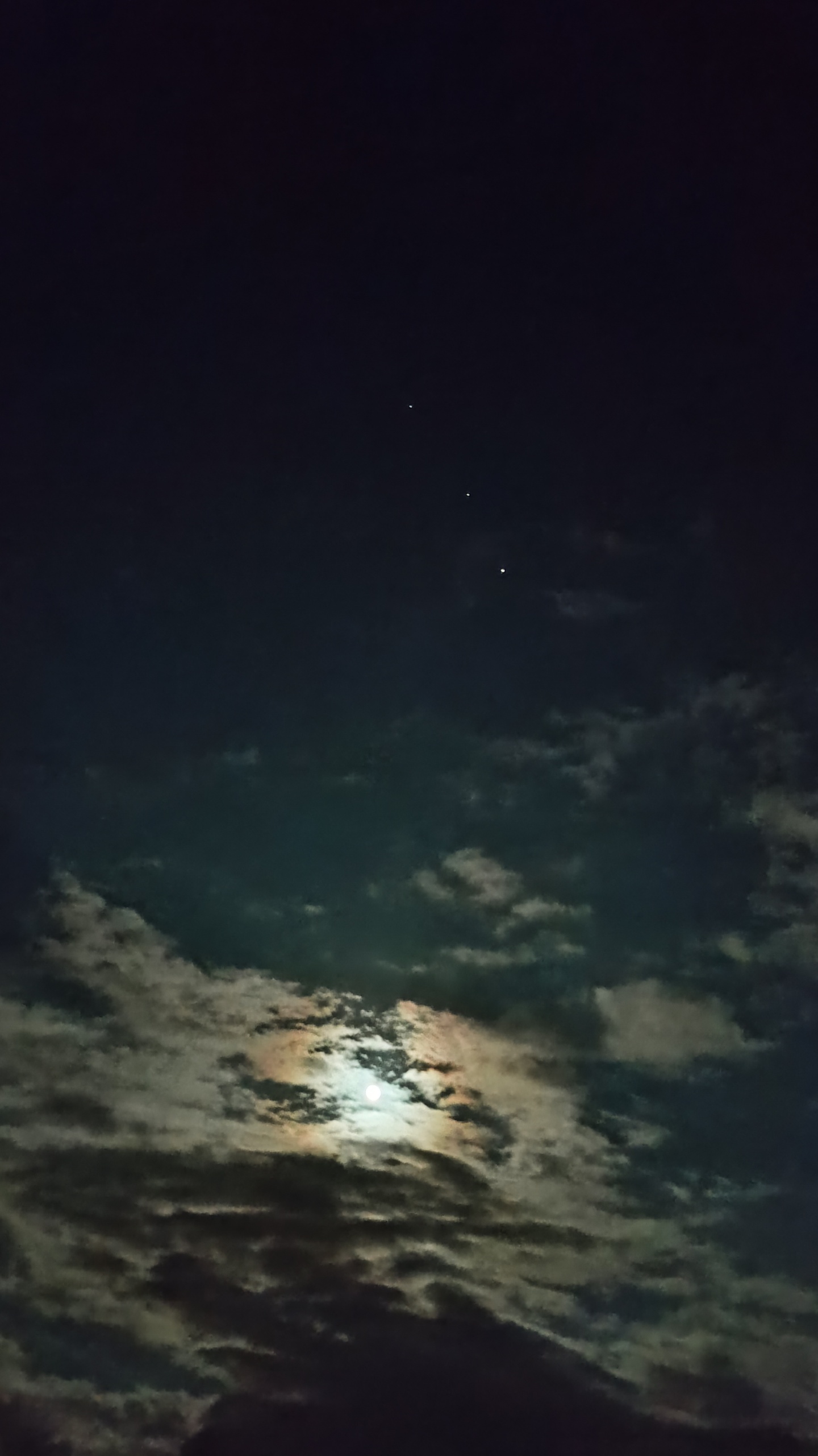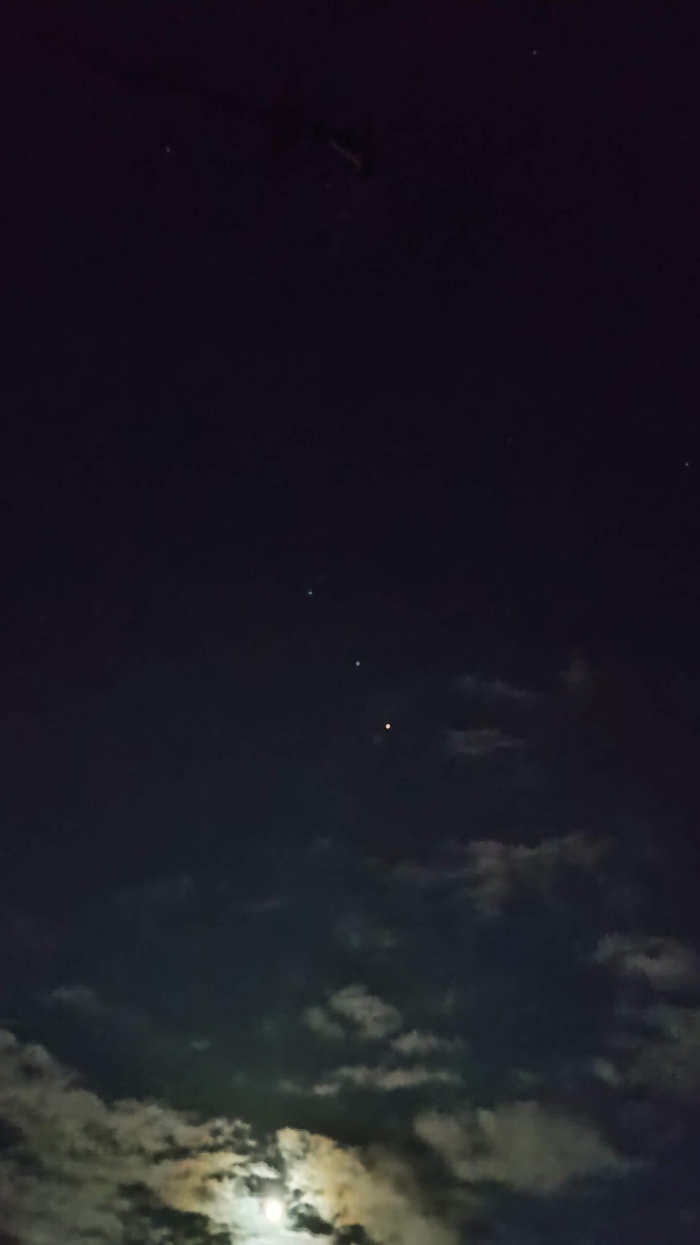 Seppur nuvoloso, il cielo dell’Arenella ci ha regalato uno scenario unico: è visibile l’allineamento dei pianeti Giove Marte e Venere attaccatissimo con Saturno ad Est sopra la Luna! Sono le ore 21 circa per questo scatto e qui non c’è inquinamento luminoso. In questo momento i pianeti si trovano nella loro orbita nella stessa parte di cielo e quindi visibili ad occhio nudo: quindi guardare ad est appena sopra la luna