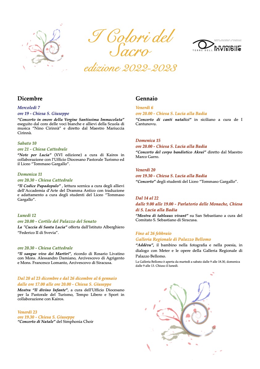 “Abbiamo deciso di dare unitarietà a tutti gli eventi culturali che si svolgono durante le feste tradizionali: Immacolata, Santa Lucia e San Sebastiano – spiega Piccione -. In un progetto più ampio che il prossimo anno vuole coinvolgere tutte le chiese di Ortigia partendo da San Martino fino alla chiesa di San Paolo con la conversione di San Paolo il 25 gennaio. Dare unitarietà al sacro e quindi a tutto ciò che ruota attorno al sacro, alla sua cultura e quindi manifestazioni culturali, concerti nelle chiese, presentazioni di libri, mostre. Dare unitarietà e coinvolgere tutti i parroci del centro storico di Ortigia in un discorso unitario con i colori che sono quelli della festa: azzurro dell’Immacolata, verde di Santa Lucia e il rosso di San Sebastiano, compendiato nel bianco perchè ci sono iniziative collegate al Natale. E’ questo il senso di un’intuizione che ogni anno vuole sempre crescere nell’offerta da proporre“.