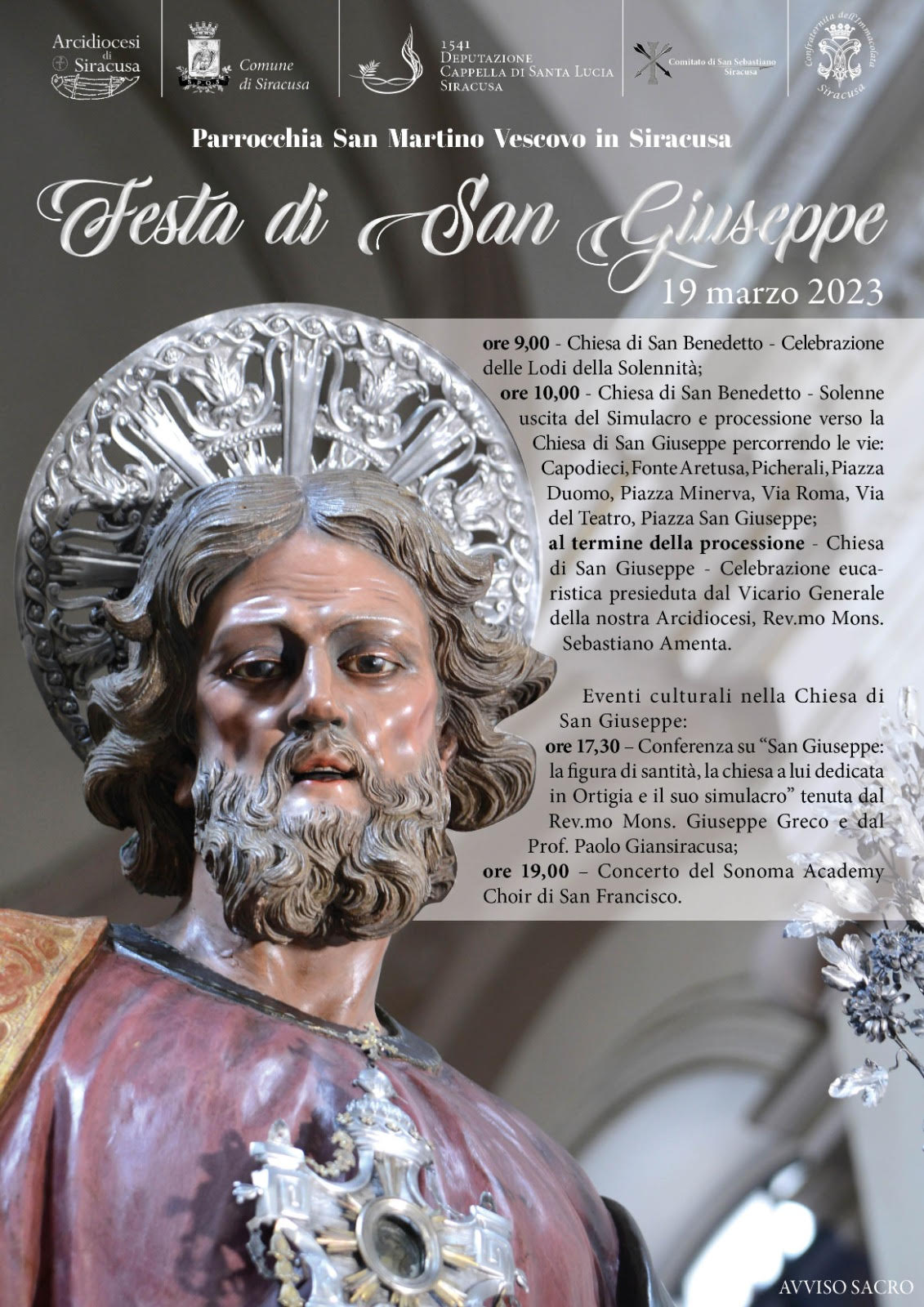 Alle ore 17.30 conferenza su £San Giuseppe: la figura di santità, la chiesa a lui dedicata in Ortigia e il suo simulacro” che sarà tenuta da mons. Giuseppe Greco e dal prof. Paolo Giansiracusa. Alle ore 19.00 concerto del Sonoma Academy Choir di San Francisco.