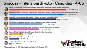 Siracusa 8 maggio 2023 – Il nuovo sondaggio condotto da BidiMedia conferma il gradimento dell’elettorato siracusano per Renata Giunta Sindaca e per la coalizione progressista che la sostiene. Secondo la rilevazione, infatti, Renata Giunta è in testa nel consenso dell’elettorato (21,5-24,5%) per la sindacatura, con un’affluenza alle urne in crescita e stimata tra il 48 ed il 52%.