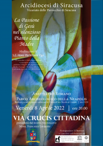 Dopo la pausa imposta dall’emergenza sanitaria, venerdì 8 aprile 2022, sarà celebrata la VIA CRUCIS CITTADINA – promossa dal Vicariato delle Parrocchie di Siracusa e organizzata dalla Basilica~Santuario della Madonna delle Lacrime – presso l’Anfiteatro Romano del PARCO ARCHEOLOGICO DELLA NEAPOLIS in Siracusa.