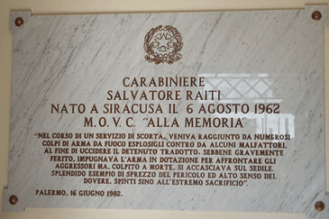 Carabiniere Salvatore Raiti. Nato a Siracusa il 6 agosto 1962. Il 7 marzo 1981 si arruolò nell’Arma dei carabinieri; ammesso a frequentare il corso d’istruzione presso la scuola allievi carabinieri di Iglesias (CA). Al termine del ciclo formativo fu promosso carabiniere il 19 settembre 1981 e destinato l’11 ottobre successivo, alla Stazione carabinieri di Enna, dove restò fino al tragico 16 giugno 1982; atto di valore per il quale fu insignito della Medaglia d’Oro al valor civile “alla memoria”.