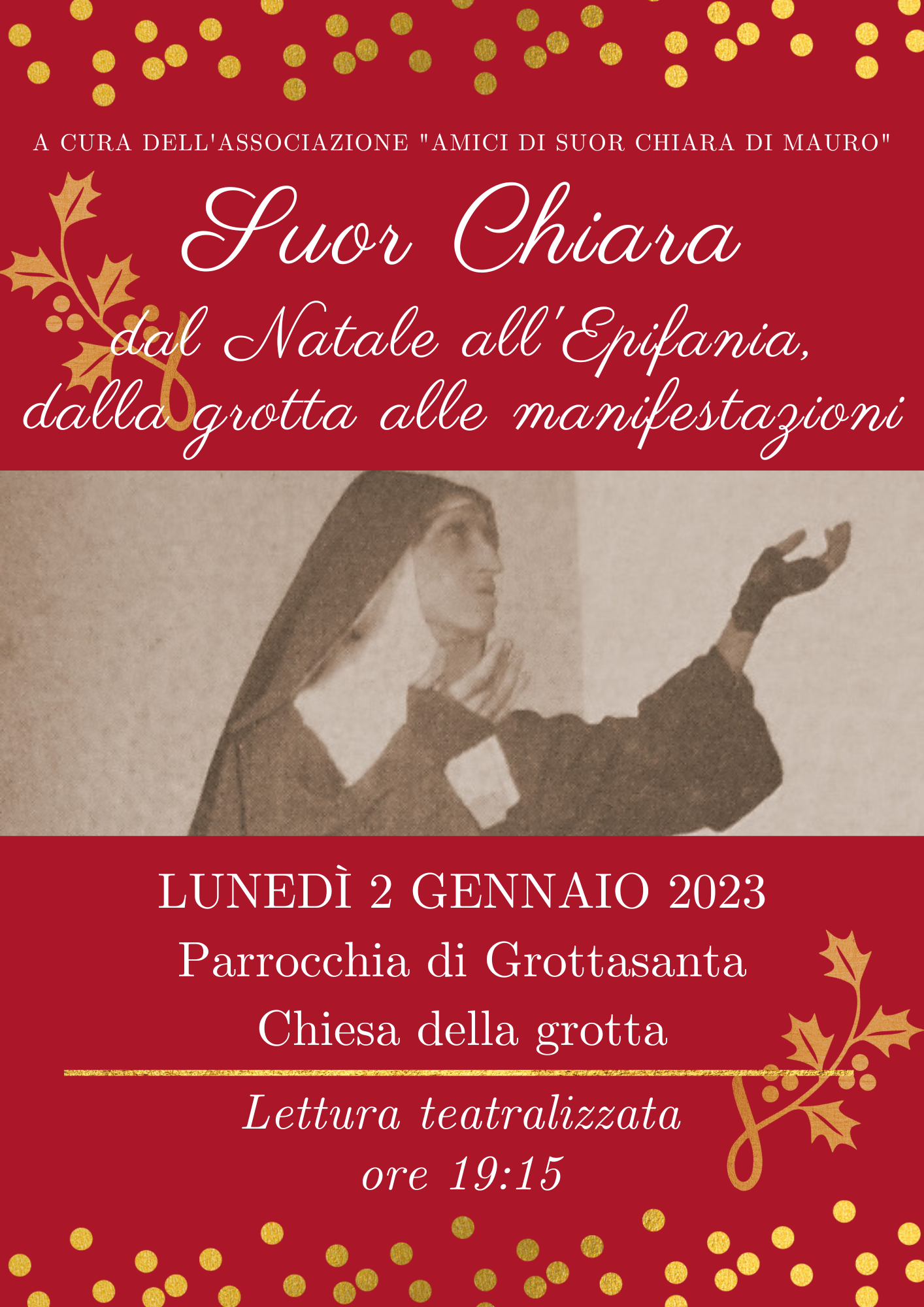 Alle ore 19:15, proprio dentro la suggestiva Chiesa della Grotta, si terrà la lettura teatralizzata “Suor Chiara: dal Natale all’Epifania, dalla grotta alle manifestazioni”, a cura dei Soci dell’Associazione “Amici di Suor Chiara Di Mauro”. A partire dalle fonti documentarie raccolte dal biografo, padre Samuele Cultrera, si vorrà dare un ritratto della Serva di Dio approfondendo, in particolare, testimonianze, racconti, episodi taumaturgici e miracolosi meticolosamente raccolti dal padre cappuccino in un corpus archivistico prezioso per la ripresa di un processo di beatificazione che attende, da anni, una ripartenza.