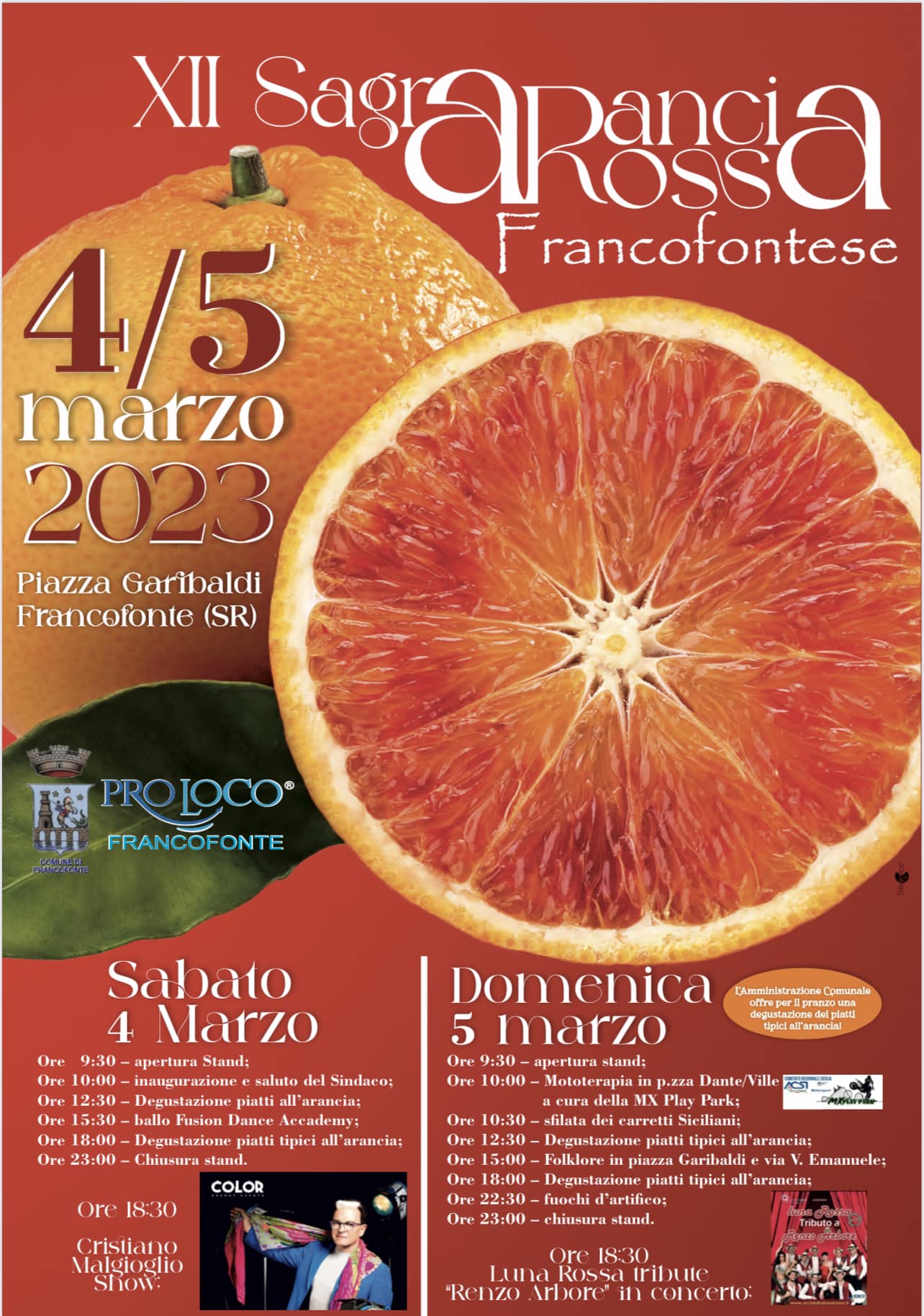 Sabato 4 e domenica 5 marzo appuntamento con la “sagra dell’arancia rossa francofontese” organizzata dalla Pro Loco Francofonte con il patrocinio del Comune di Francofonte e che si terrà in piazza Garibaldi.